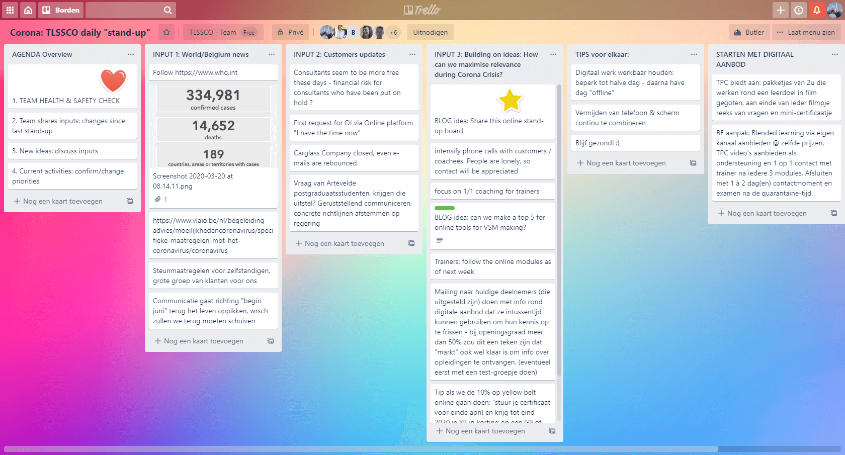 Om te beginnen is het belangrijk te weten dat ons team elke donderdagochtend samenkomt in ons kantoor in Antwerpen om aan ons fysiek verbeterbord een stand-up meeting te houden. Dit wekelijkse overlegmoment is voor ons de ideale opportuniteit om de lopende zaken met elkaar te bespreken, om nieuwe ideeën uit te wisselen en om nieuwe verbeterprojecten aan te vatten. Het geeft ons team een houvast om de juiste beslissingen te maken en de juiste prioriteiten te leggen. Maar toen werd het steeds duidelijker dat fysiek samenkomen geen evidentie meer was en dat de komende weken thuiswerk de nieuwe norm zou worden.